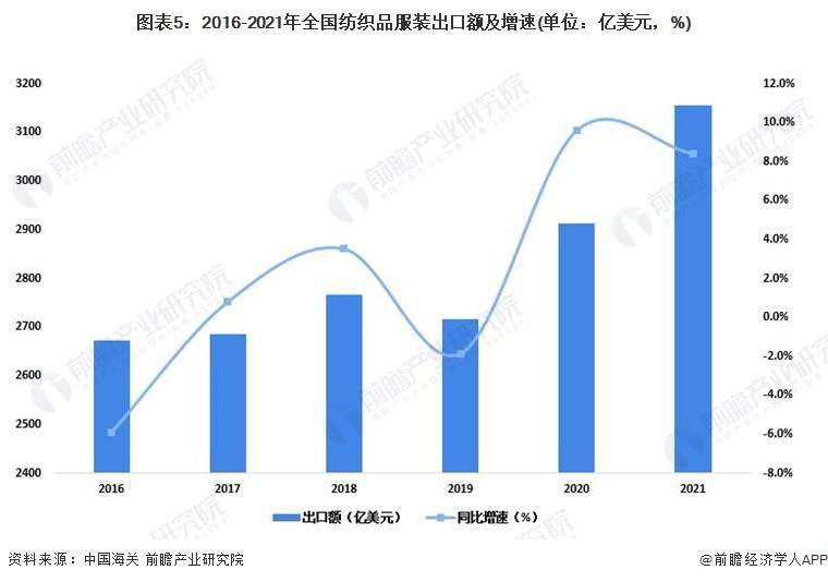 In 2021, China's textile and clothing exports will reach 315.5 billion US dollars, an increase of 8.4% year on year, a historic high. Among them, the textile export reached 145.2 billion US dollars, down 5.6% year on year; Garment exports reached US $170.3 billion, up 24% year on year.